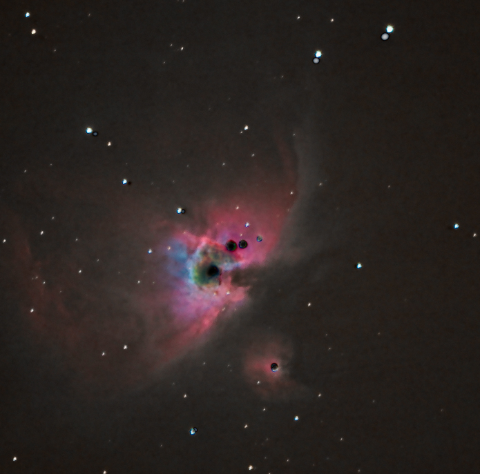 It features the same trapezium nebula that I captured at my first attempt. For comparison, here is the great nebula of orion as on wikipedia and the same photo from which I subtracted my result:
