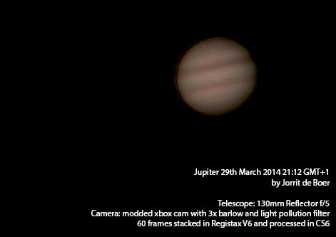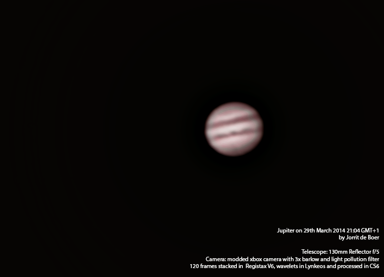 After getting some feeling where the barlow’s focal point is during daytime last week, yesterday evening I could finally get a supersized Jupiter on the screen 🙂 . Due to poor seeing conditions (instable atmosphere caused by temperature fluctuations) and narrow focal range, I couldn’t get focus right. The picture below shows my first attempt at stacking and slightly processing a video. I was very cautious not to overprocess the image. This resulted in a pretty unsatisfying image with a stacking artifact at the top of jupiter: