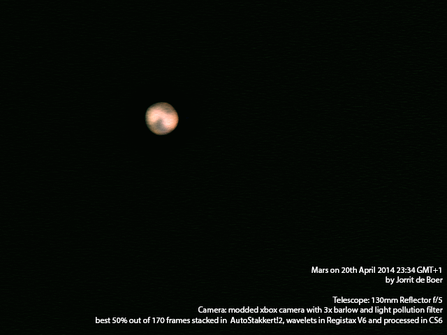 Last night the sky was finally somewhat clear while I was near my telescope and had time. Saturn was still way to low at reasonable hours, while Jupiter was already behind the rooftop and lets face it, I have captured plenty of Jupiters lately. So Mars it was.