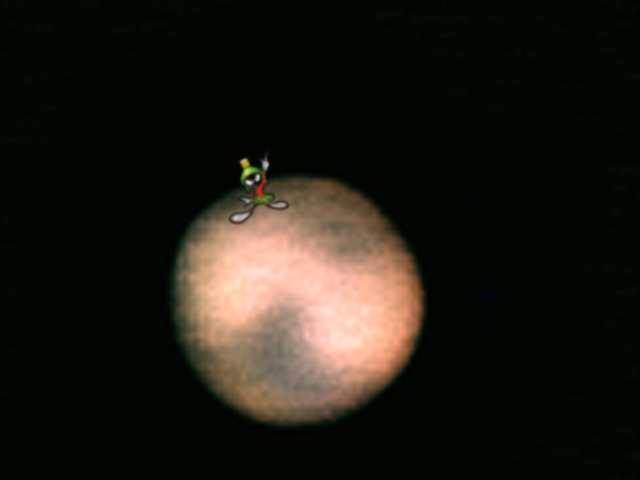 I couldn’t get focus exactly right as I wanted to due to the poor seeing. Focussing with my telescope is a matter of slightly turning a knob, waiting for the image to stabilize, adjusting the mount to get Mars back into view, waiting again for the image to stabilize, see how good or bad the focus is and then adjust the knob again….. So it takes a while. Finally some Martian dude called Marvin made clear that I should stop spying on his planet (image below), so I went with the focus I had, shot a couple of videos and called it a night.