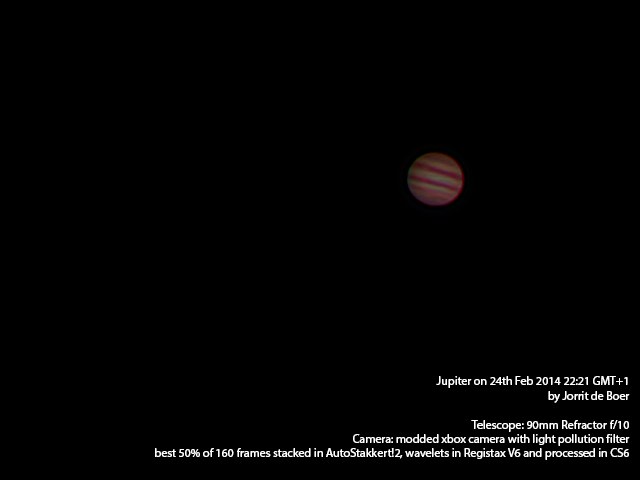 2-24-14 Jupiter Published April 27, 2014 at 640 × 480 in Astrophoto processing ← Previous jupiter xbox camera original Share this: Click to share on X (Opens in new window) X Click to share on Facebook (Opens in new window) Facebook Click to email a link to a friend (Opens in new window) Email Like Loading...