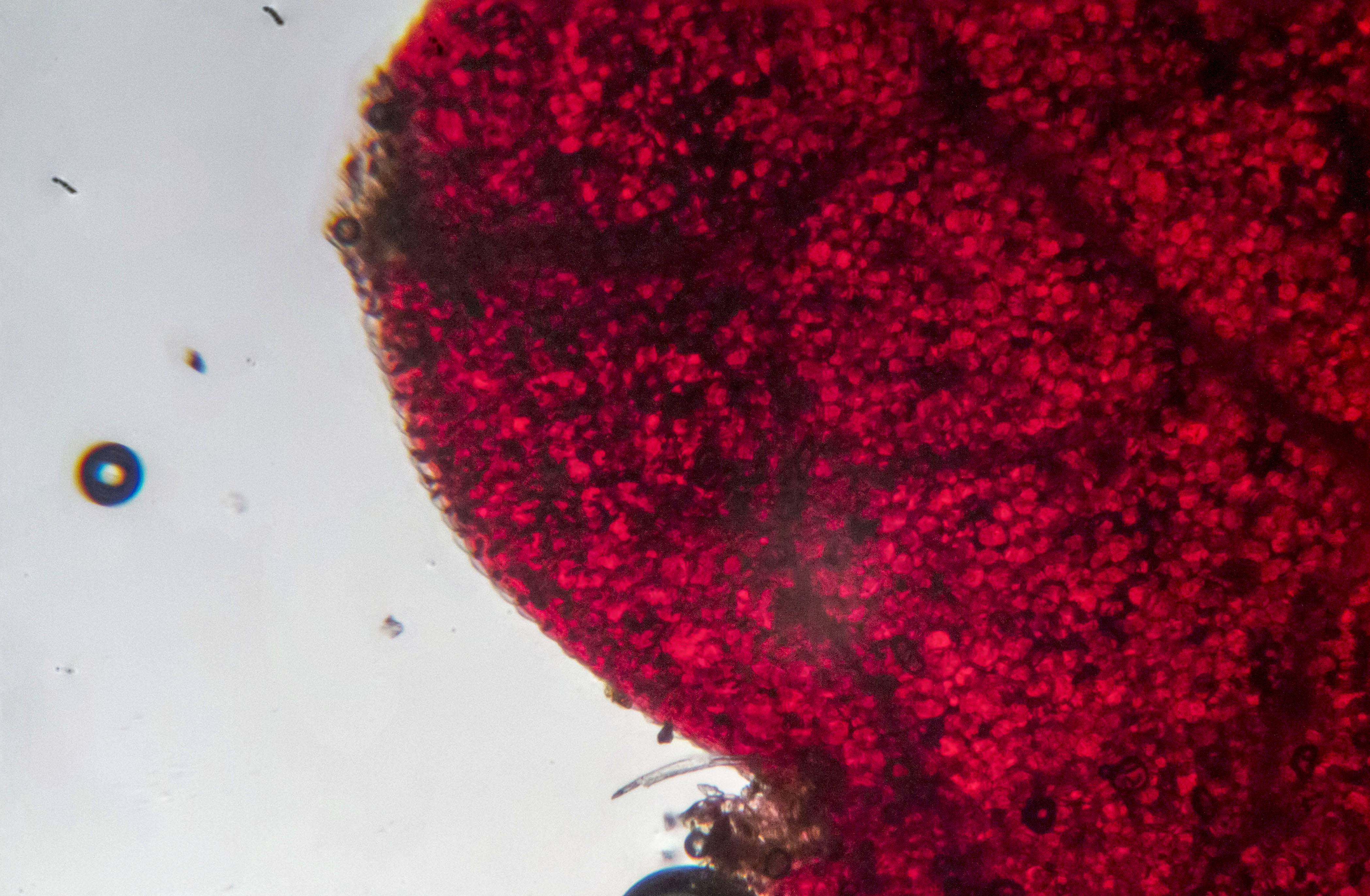 I really love it’s brilliant red color. The image below shows the same area but at higher magnification. Stacking the differently focused images was quite a hastle, but it worked out okay for these images. I had one at even higher magnification (400x), but stacking this produced a blur.