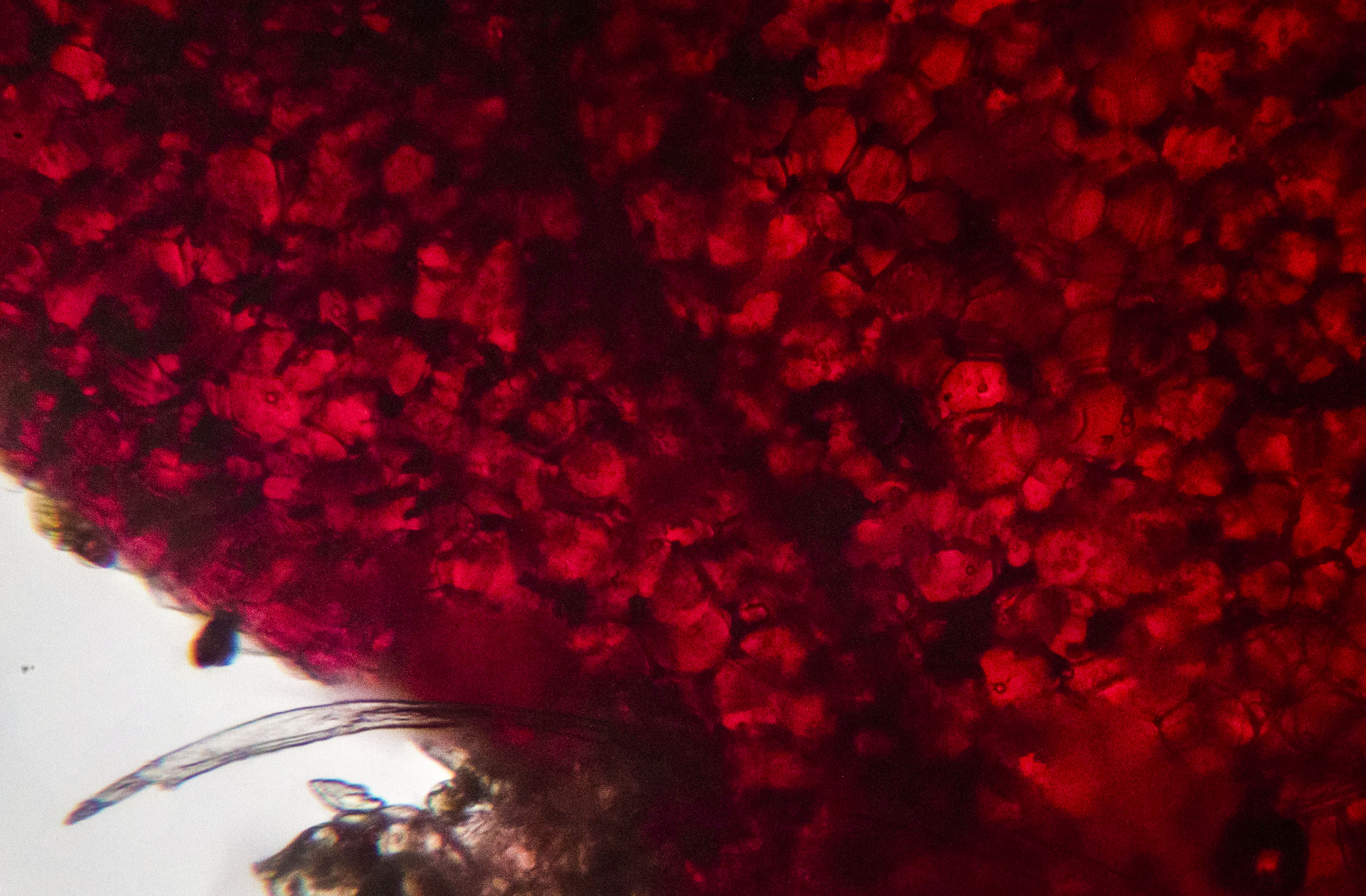 Red leaf of a begonia through the microscope at 40x