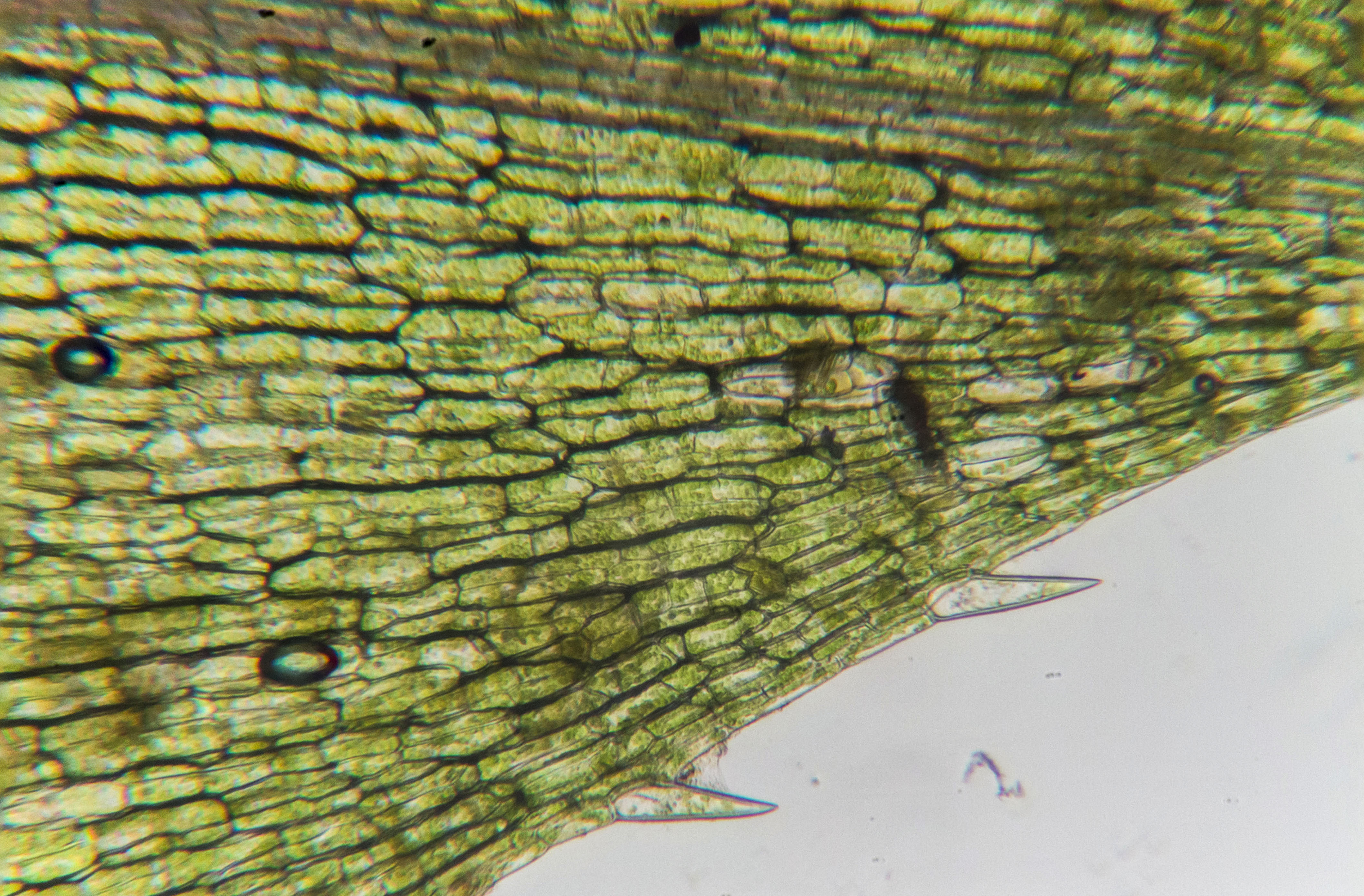 The image above shows a close up at 100x of a nylon wrist band I got from a music festival. Purely synthetic. Absolutely not synthetic, is the waterweed in the image below. It shows all the little green chloroplasts that give the plant its green color. The way you see it here is somewhat different from what I saw through the microscope. I could see a lot of cytoplasmic (the liquid that fills the volume of the cell) streams, which is highlighted by lots of chloroplasts that travel through the leaf. Maybe I will make a video of that some day 🙂 .