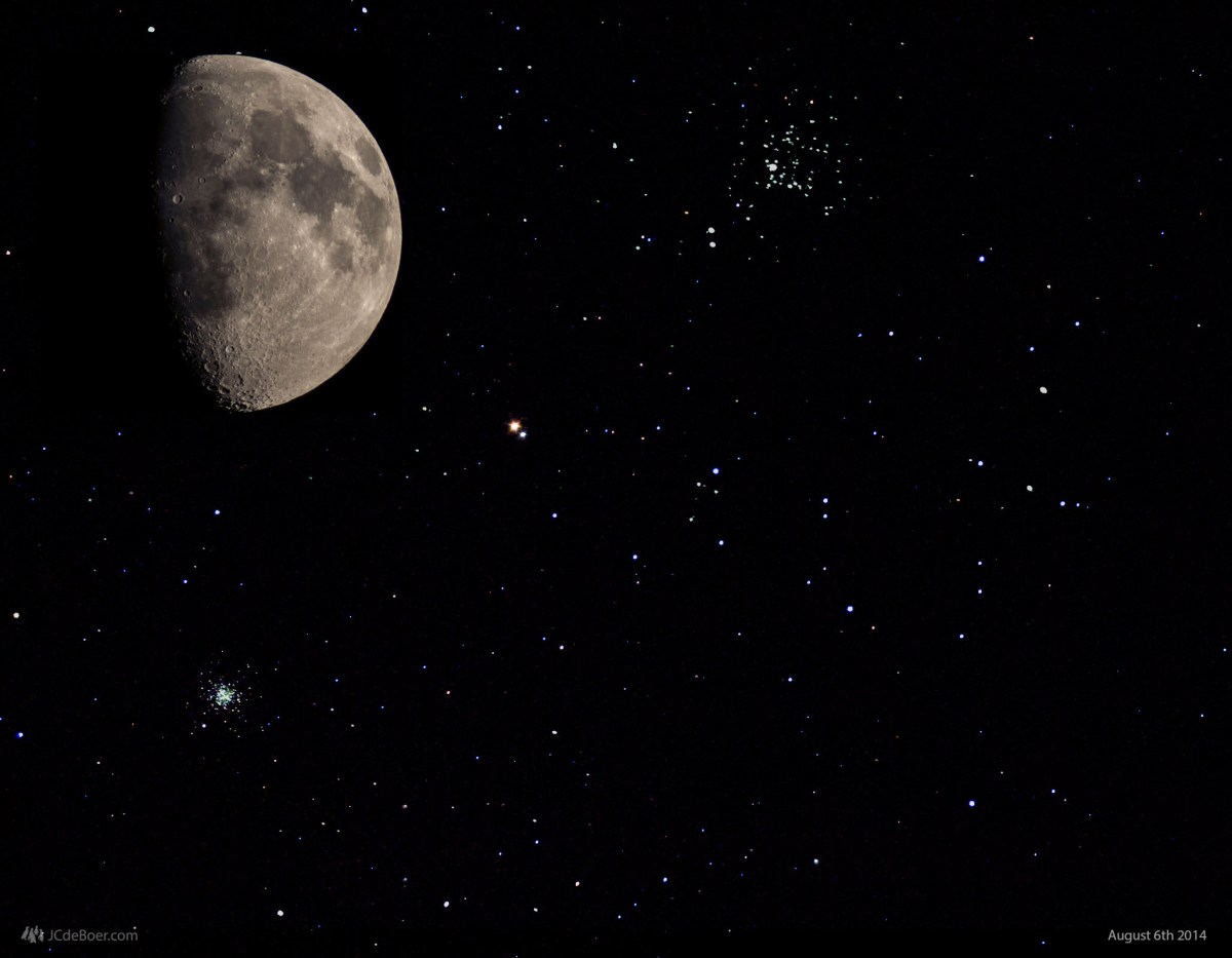 Wallpaper of my imaging session on the 6th of August 2014. Visible are telescopic images of the Moon, open cluster M11, globular cluster M13 open cluster M39 and double star Albireo.