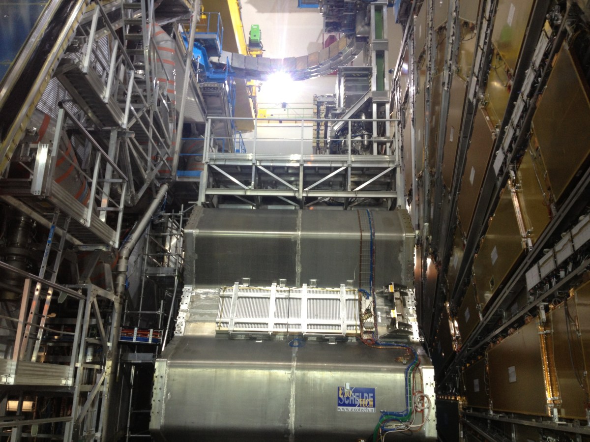 Atlas detector at CERN. The end cap toroid magnet is taken out of the inner detector (on the left) for service. The gold colored panels on the right are the muon detectors.