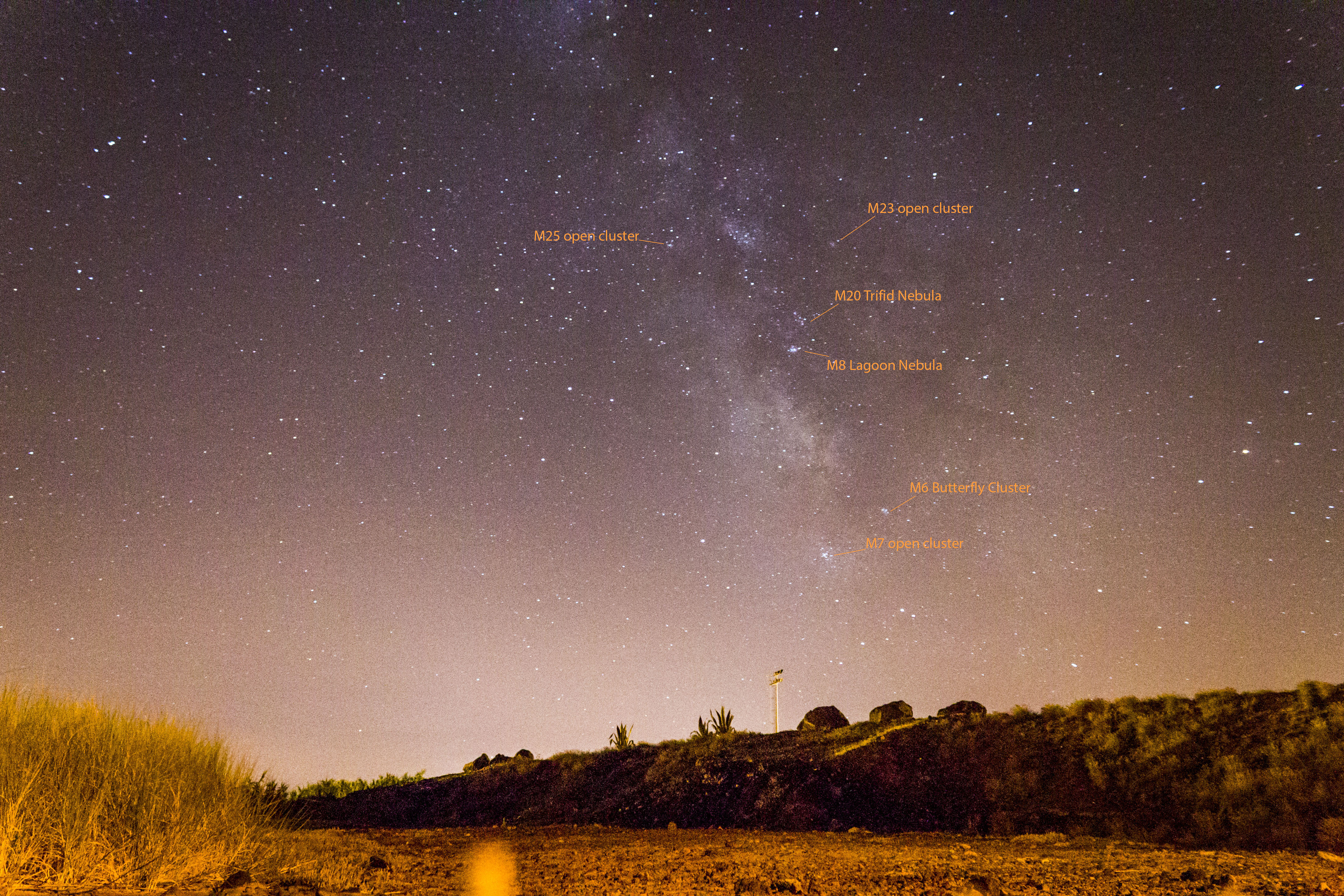 Just left of the center lies the constellation Sagittarius, in a region that isn’t visible from the Netherlands. This part of the sky contains a lot of the most beautiful deep sky objects. To show you what I mean, let me point out just the most prominent ones visible in this image: