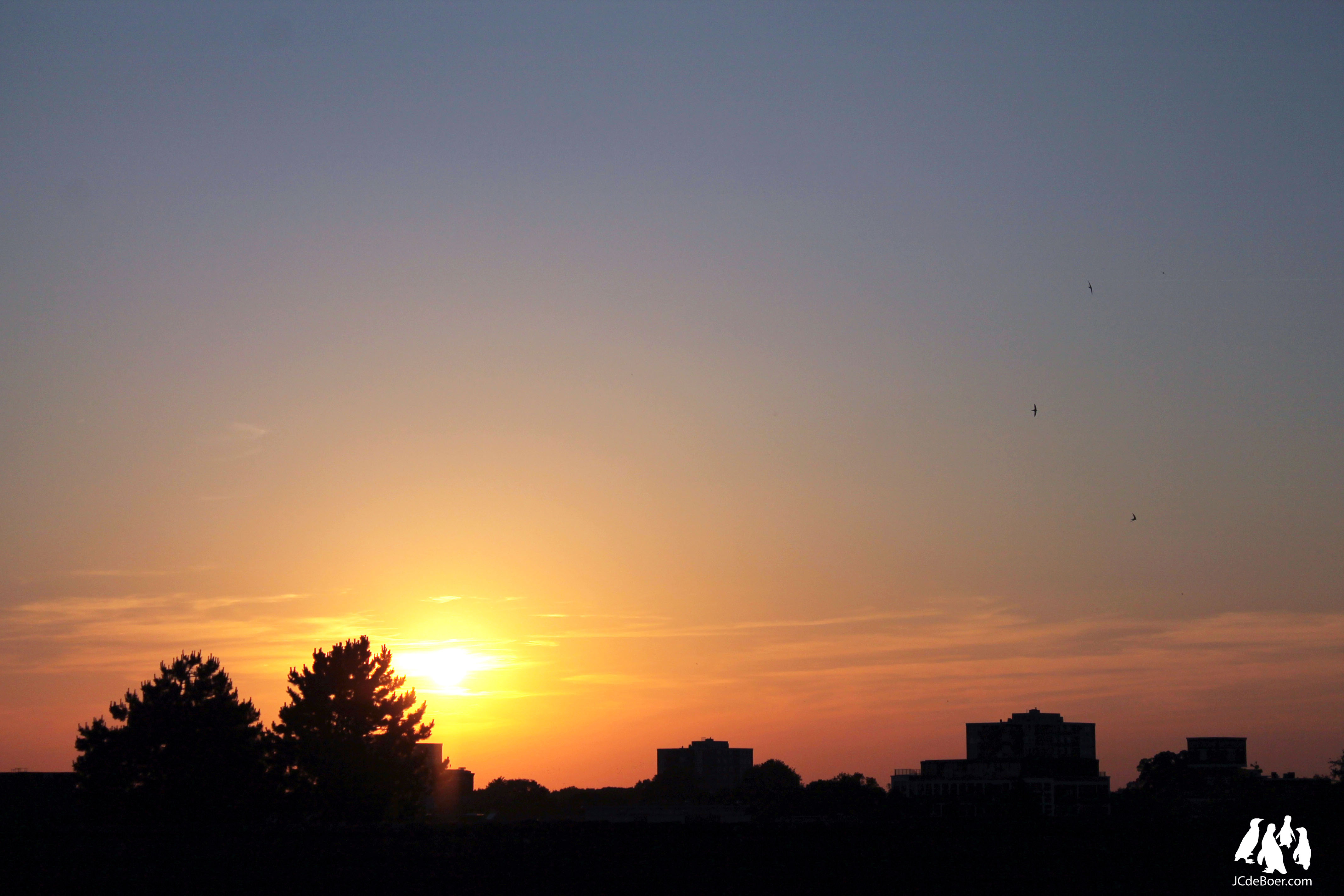 A few days ago I finally got a Digital Single-Lens Reflex (DSLR) camera; a Canon 1100d with a 18-55mm zoom lens. It is the very first SLR camera that I ever took photos with, so the whole thing is quite new to me. On of the first pictures I took was this sunset image, which (accidentally) also shows 5 swallows hunting for small bugs.