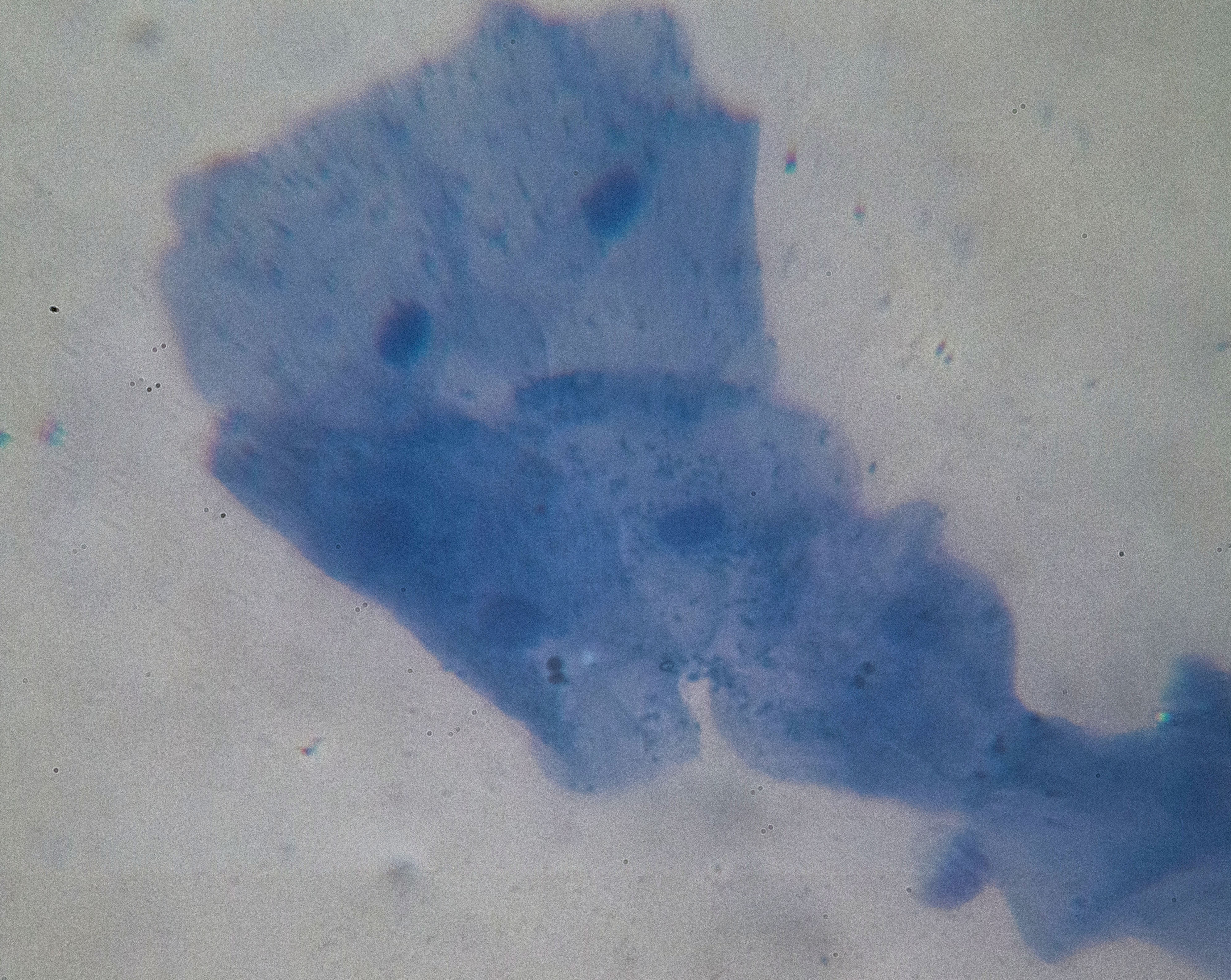 The image below is again saliva, but this time imaged at higher magnification (300x) and moreover, stained with methylene blue. The nuclei are now even more apparent and the smaller dark dots that are all over the cells are bacteria.