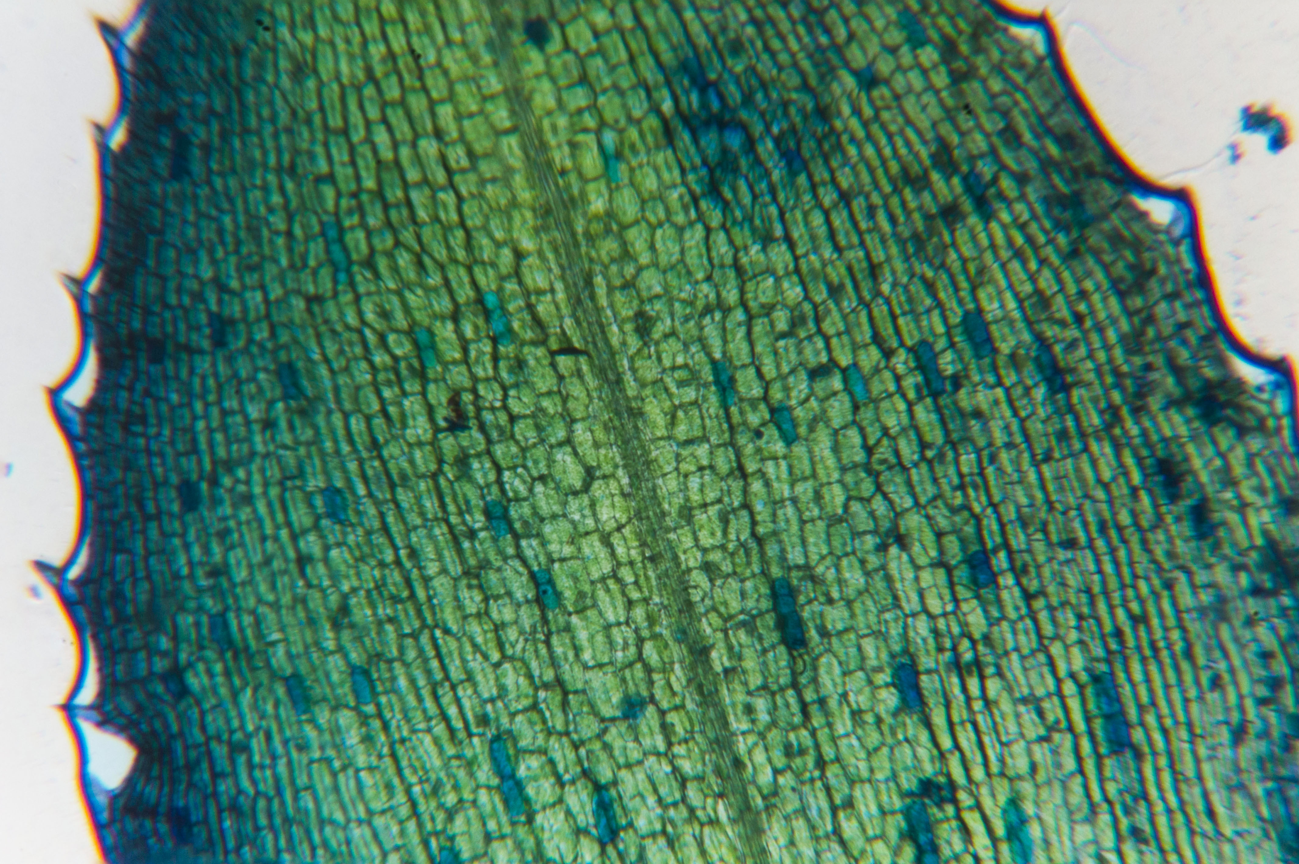 Upon magnification, it becomes more clear that unstained cells show more detail. Lots of chloroplasts are apparent in the unstained regions of the image below. I already trimmed the outer edges off the image, but you can still see how the center of the image is way sharper than the blurred edges.